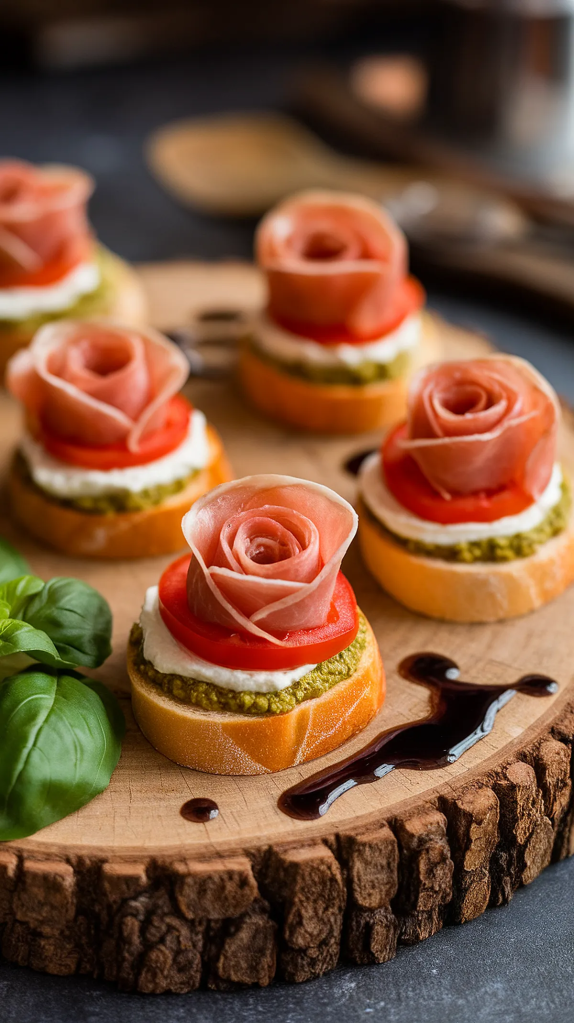 - Roll thin slices of prosciutto into rose shapes to garnish each crostini platter