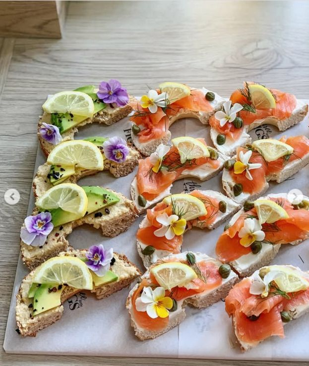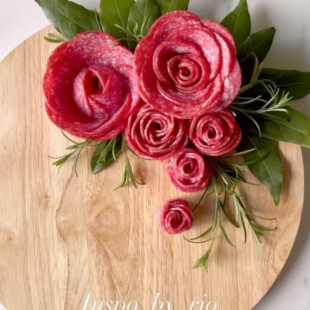 - Decorate the top with thin slices of deli meats rolled into rose shapes, tucked into little divots in the bread.